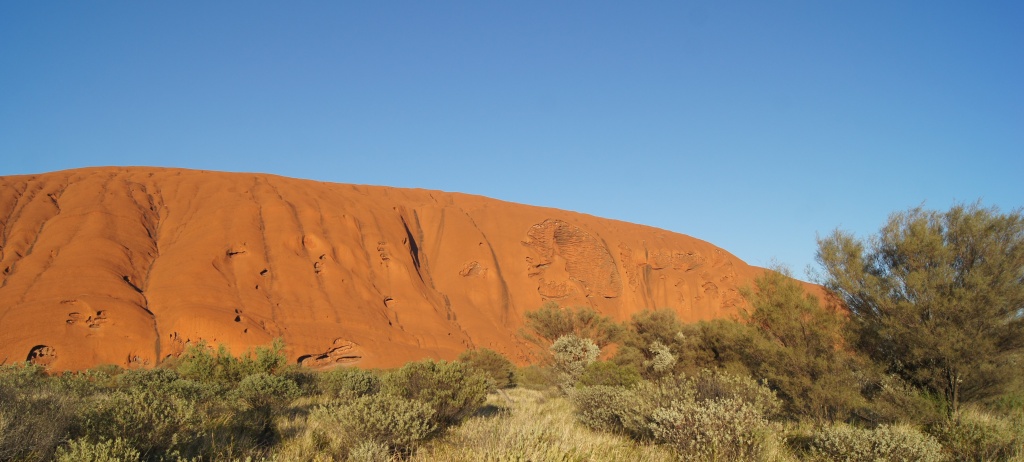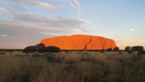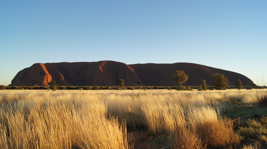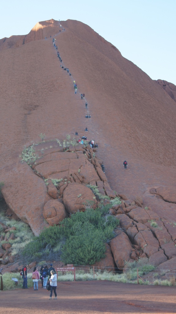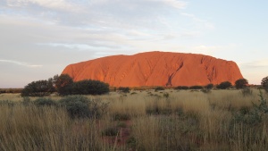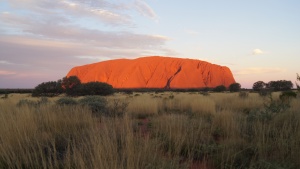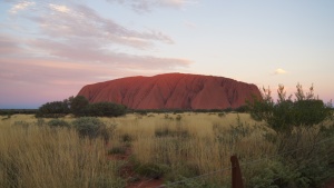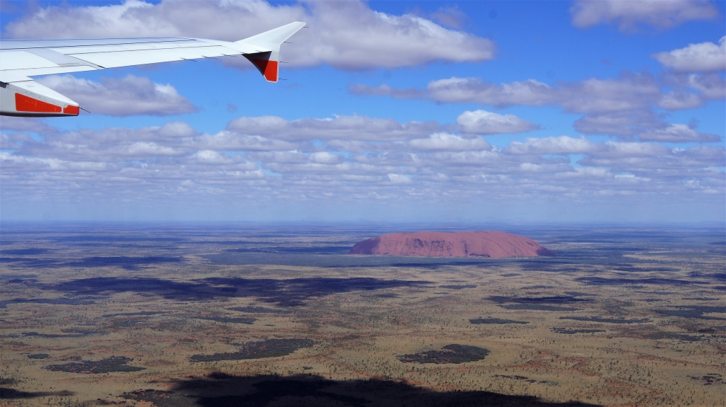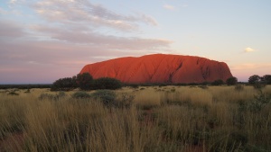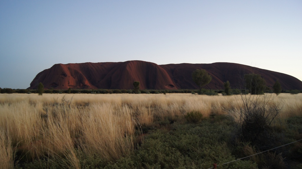 Po 3,5 godzinnym locie z Sydney (2180 km) lądujemy na lotnisku najbliższym skały – Yulara. Po odebraniu samochodu na lotnisku (Avis) meldujemy się w hotelu. Zdążymy jeszcze na krótki objazd skały i obserwacje zmiany jej ubarwienia przy zachodzącym słońcu. Co prawda z jazdą samochodem nie było tak łatwo, bo to i ruch lewostronny, i pierwszy raz prowadziłem samochód z automatyczną skrzynią biegów. Pierwszy problem jast łatwiejszy do pokonania, ale jazda bez sprzegła nie jest łatwa. Ale po 5 dniach jazdy automatem zaczęło mi się to podobać.
