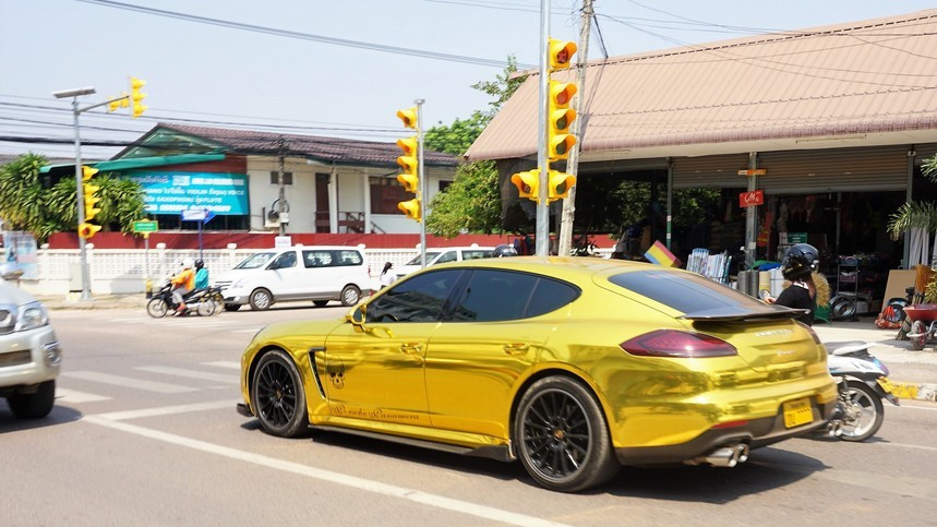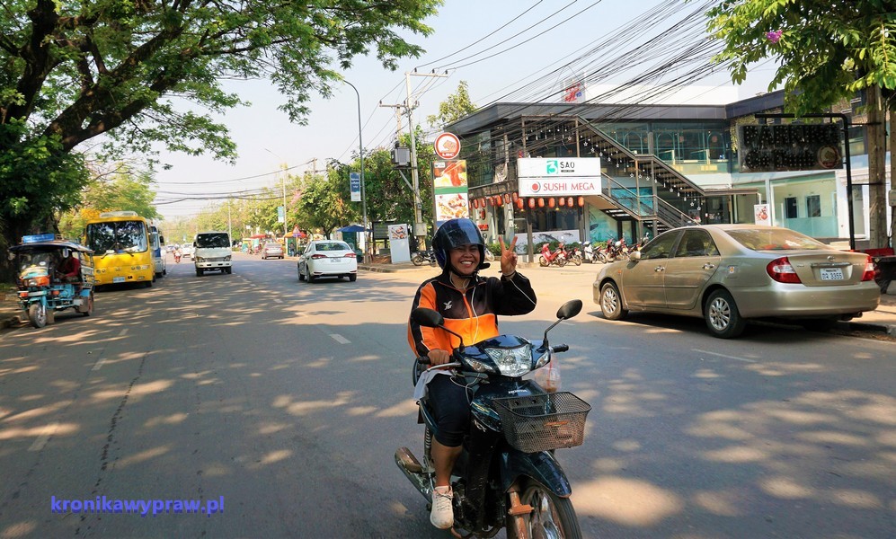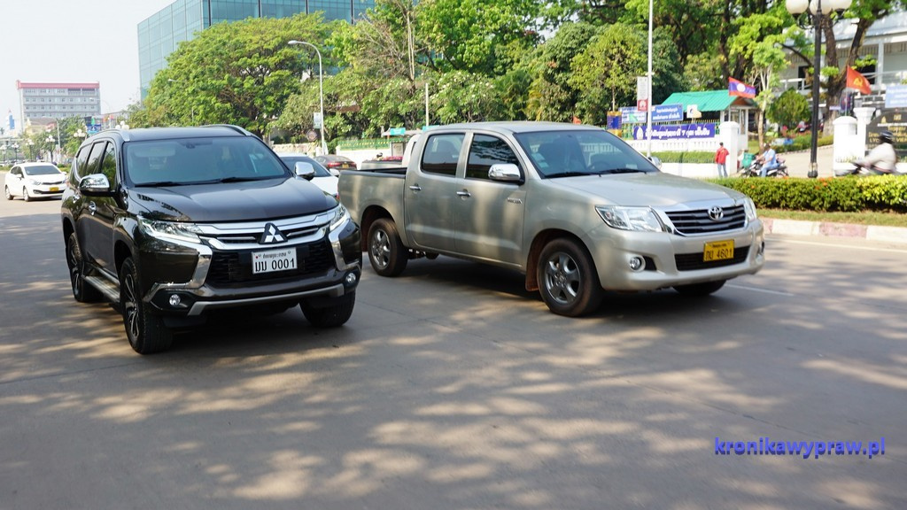 Laos – bardzo biedny kraj, ale w stolicy na ulicach same Toyoty i inne wypasione marki samochodów. Na jednej z fotek złapałem nawet złote porsche. No są też tuk-tuki i wrzechobecne motocykle. A na nich uśmiechnięte laotanki (czy laoski a może laski?).