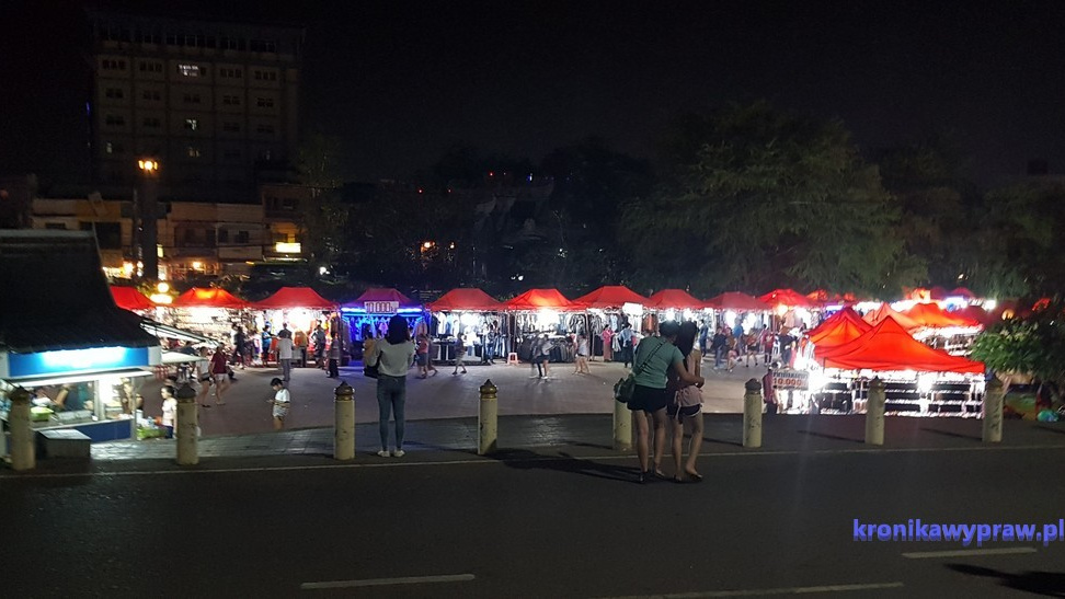 Wieczorem odwiedziliśmy jedną z atrakcji dla turystów: Night Market. Wieczorem wzdłuż bulwaru nad Mekongiem ustawiony jest targ nocny z dużą liczbą straganów z ciuchami, pamiątkami i jedzeniem. Wśród tego wszystkiego biegają, ćwiczą, jeżdżą na rowerze i tańczą Laotańczycy.
