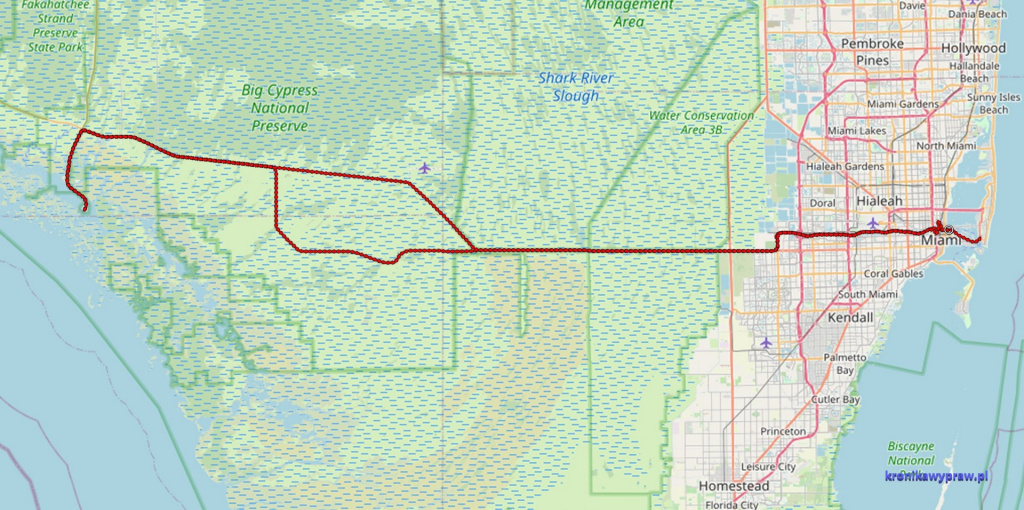 Odległość z Miami do zatoki Meksykańskiej, czyli w poprzek półwyspu Floryda to około 130 km. Można ją przejechać drogą US 41 w czasie poniżej 2 godzin i niewiele zobaczyć. My zjechaliśmy z tej trasy na lokalną drogę nr 94 i to był strzał w dziesiątkie.