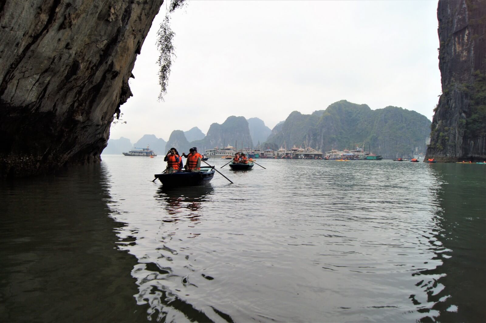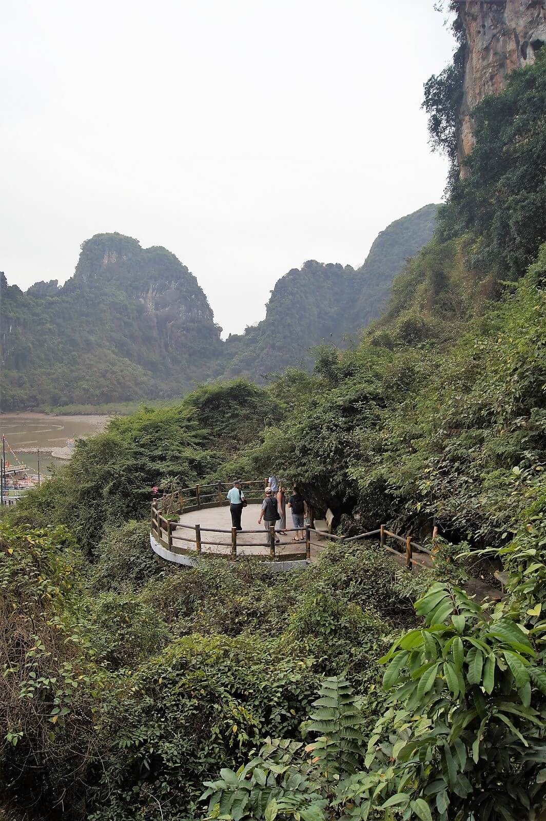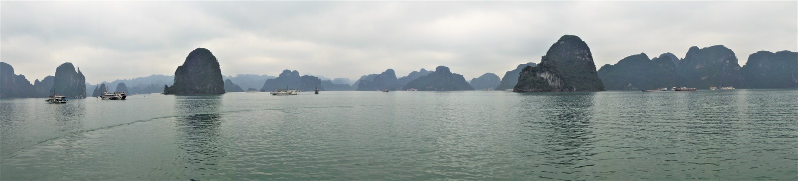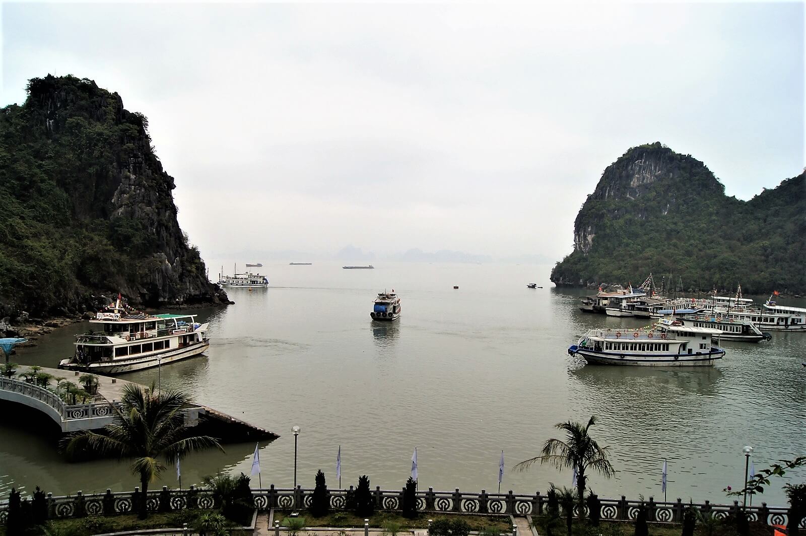Autobus pod hotel podjechał zaraz po godz. 8:00, po drodze miał przystanek w sklepie z m.in. kamiennymi rzeźbami i ok 12:30 byliśmy na przystami statków. Przy wyjeździe z Hanoi trochę padało, było pochmurno, chociaż amerykańskie prognozy pogody zapowiadały pełne słońce i temperaturą ok. 30 °C. Trochę się pomylili ale i tak nie było źle. Nad zatoką Ha Long pogoda poprawiła się, było tylko małe zamglenie. Z tą pogodą na Ha Long trzeba miec szczęście, 3/4 roku jest w chmurach i bez słońca.